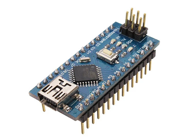 لوحة Arduino Nano مع محمل CH340 – بمنفذ Mini USB هي لوحة تحكم دقيقة صغيرة الحجم ومنخفضة التكلفة تعتمد على المتحكم ATmega328P.